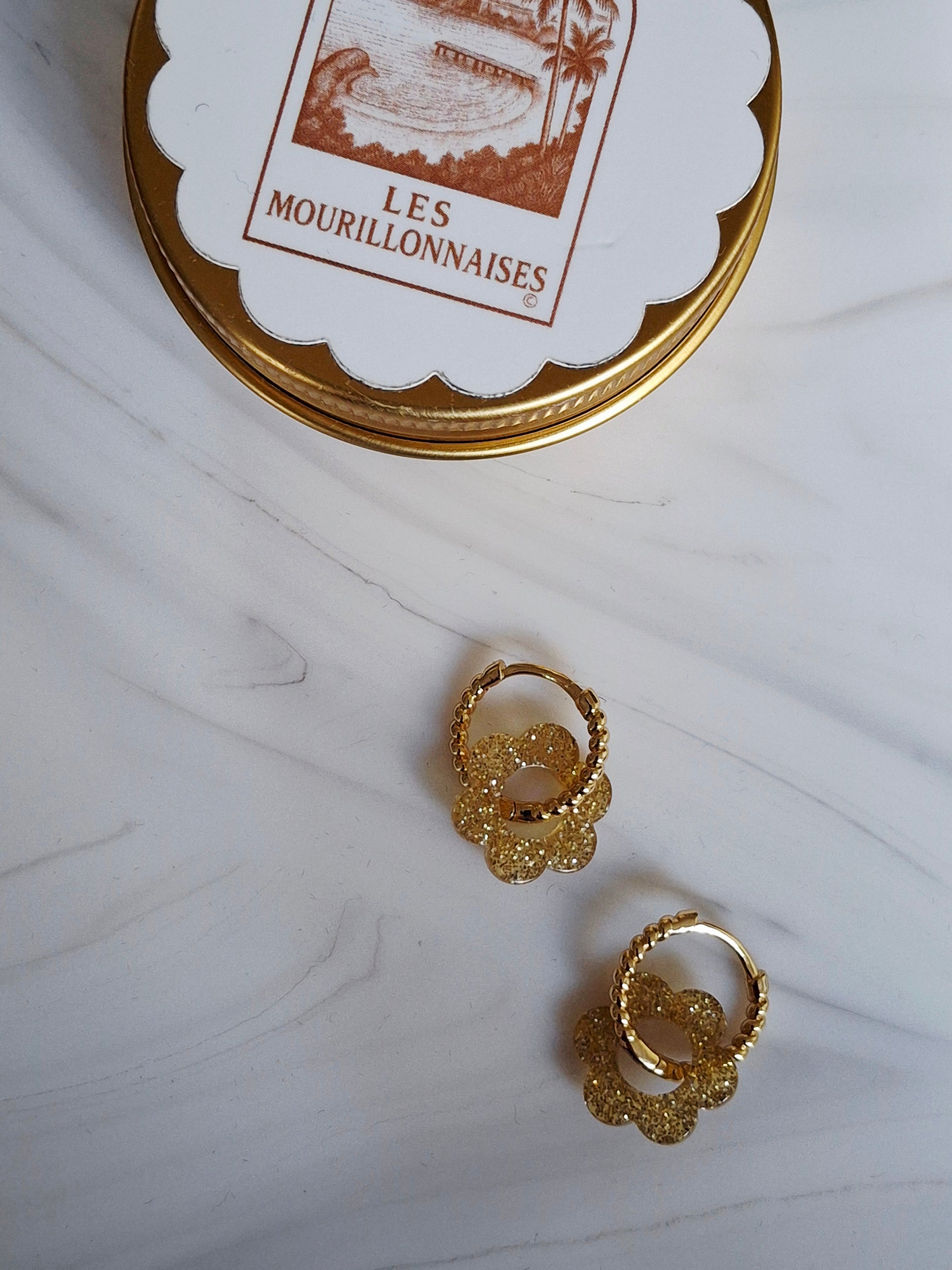 Créoles ronde de 2 cm de long et 1 cm de large, ornées d’une délicate pupille en fleur pailleté doré. Un bijou lumineux et féminin, parfait pour ajouter une touche chic et scintillante à vos tenues.