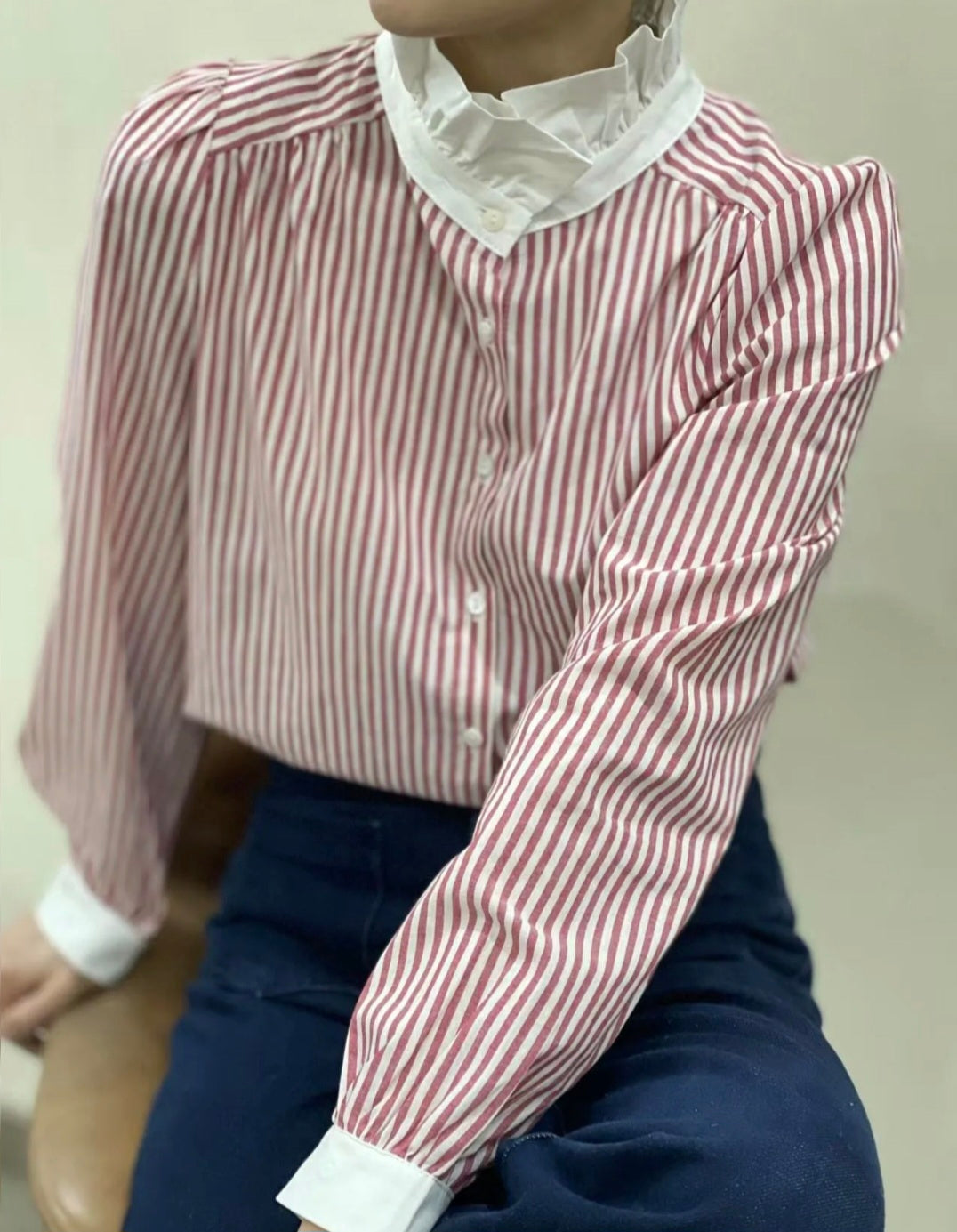 Confectionnée en coton doux, elle séduit par son imprimé à fines rayures rouges et blanches, son col montant volanté et ses poignets contrastés écrus qui lui apportent une touche de raffinement.
